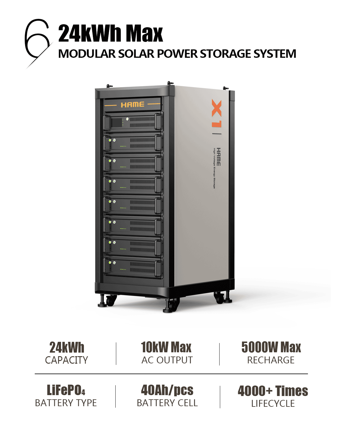 此次展会同时展出“家庭及商业太阳能储能系统”,采用模块化设计,电池模块采用磷酸铁锂电芯,单个模块容量4000Wh,单个机柜电量为8kWh-24kWh选配,可多组级联组成更高容量和输出功率,主控单元支持太阳能或市电最高5kW输入功率,10kW输出功率。整套系统可满足日常家庭或商业用电,通过错峰充电和太阳能充电,既环保又经济,富余电量自动并网公共电网创收。