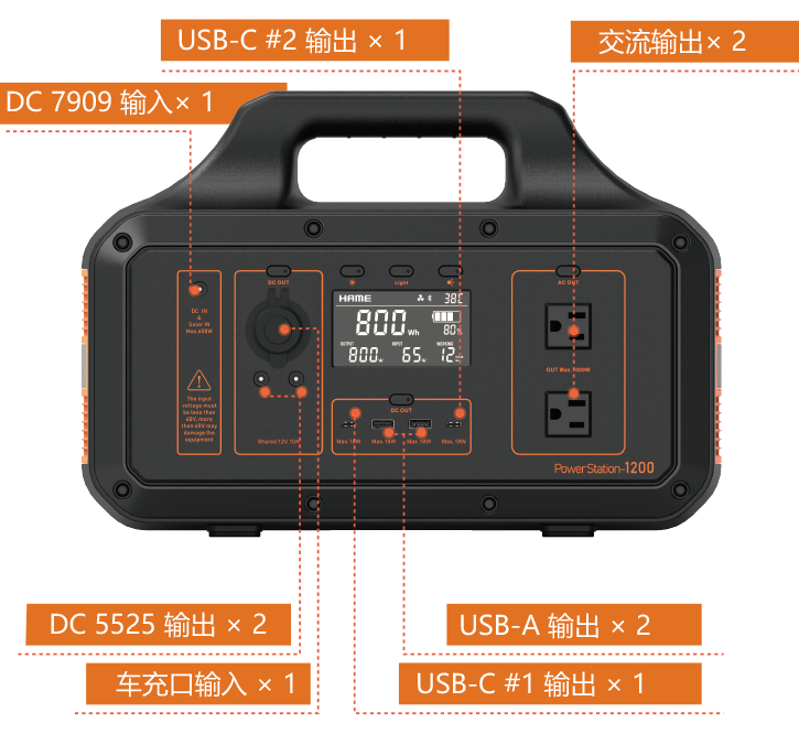 输出接口:AC*2、USB-C*2、USB-A*2、DC*2、点烟器*1